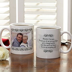 A picture is certainly worth a lot of love, hugs and lasting memories!Surprise your significant other this Valentine's with our exclusive photo coffee mug that's certain to warm their heart - you choose any photo on the front and any 1-line title, 3-line message, and 1-line closing on the back!Upload any color or black & white photo (wallet size to 8 x 10) and we'll capture your photo on our My Words To You Photo Coffee Mug. Your treasured photo will then be delicately bordered by a heart and swirl design for a finishing touch!We will enlarge your photo to fill the imprint area as much as possible. Imprint will be approx. 2 1/2" x 3". TO ORDER: Please electronically upload your photo below (further instructions in Personalization Tips).PLEASE DO NOT ENTER ALL CAPS IN PERSONALIZATION FIELDS Readmore .. .